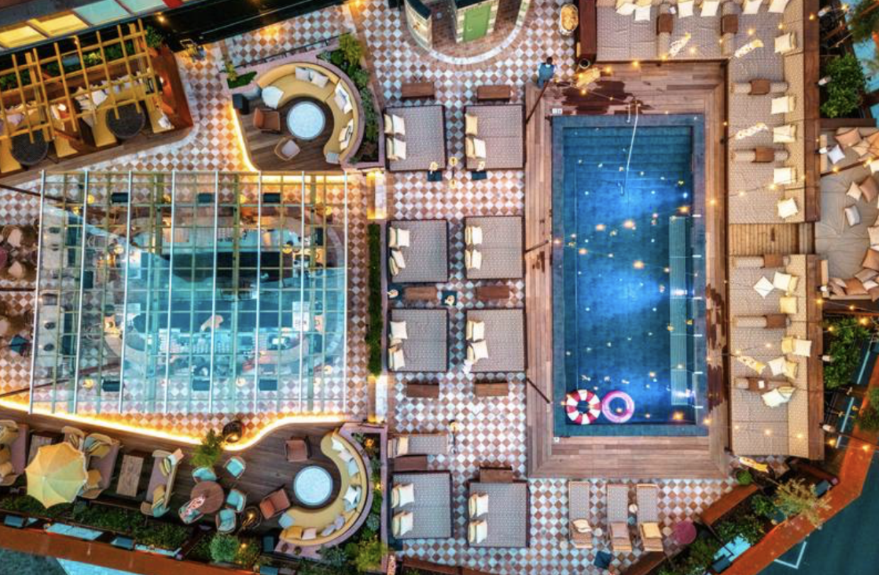 Jacyz har skybar og poolklub 100 meter over jorden. Her kan du mod et mindre tillæg nyde en uforlignelig udsigt og lækre varme pools.