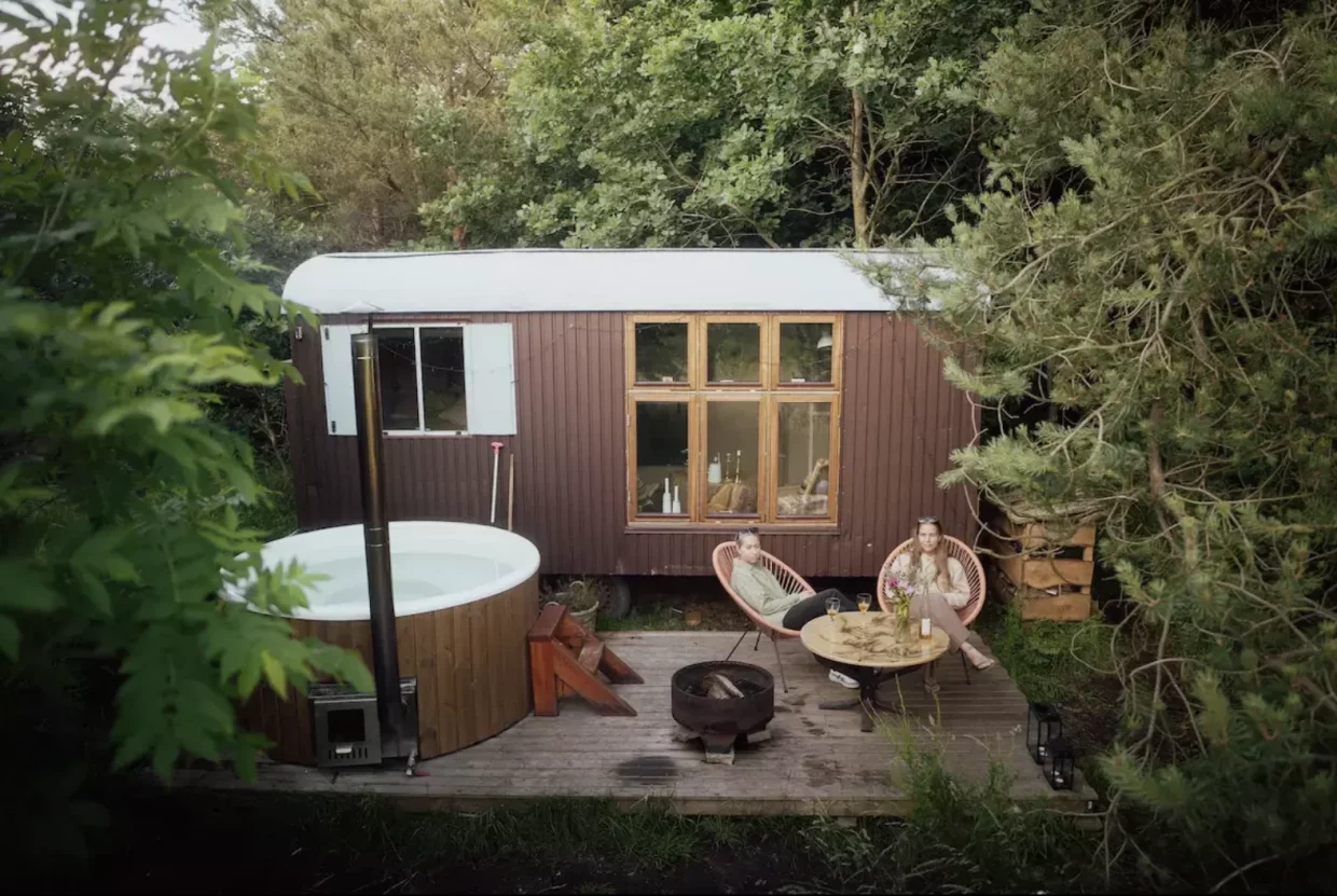 Midt på en bakketop, omgivet af fredelige skove og åbne enge, står en hyggelig, ombygget skurvogn. Med en king-size seng, loungestole og en autentisk indretning, byder vognen på den perfekte ramme for en afslappende getaway. På terrassen kan I nyde et glas bobler, tage en dukkert i jeres eget vildmarksbad eller måske være heldige at se rådyr græsse i skumringen.