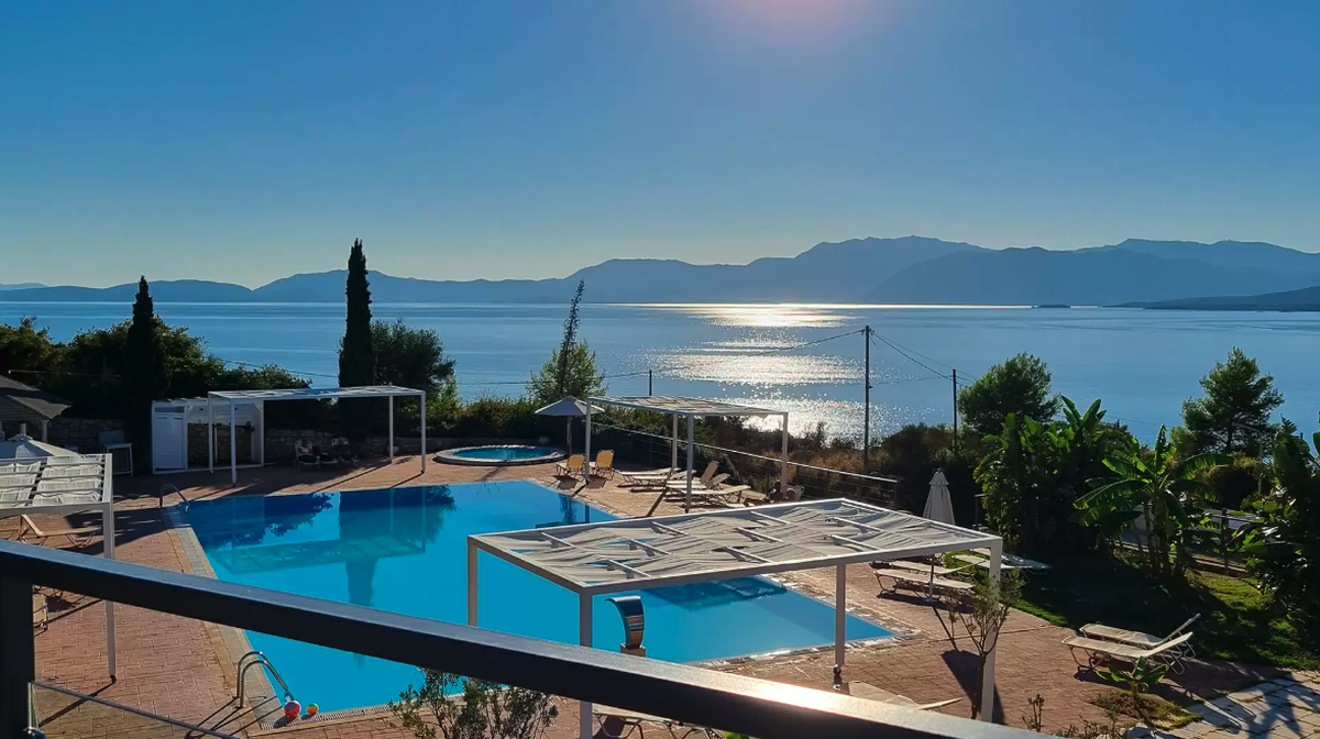 Fra hotellet er der en fantastisk udsigt over havet samt naboøen Lefkas. Ved solterrassen finder du det en dejlig pool og separat børnepool. Her er ligeledes liggestole, skyggesejl og poolbar.